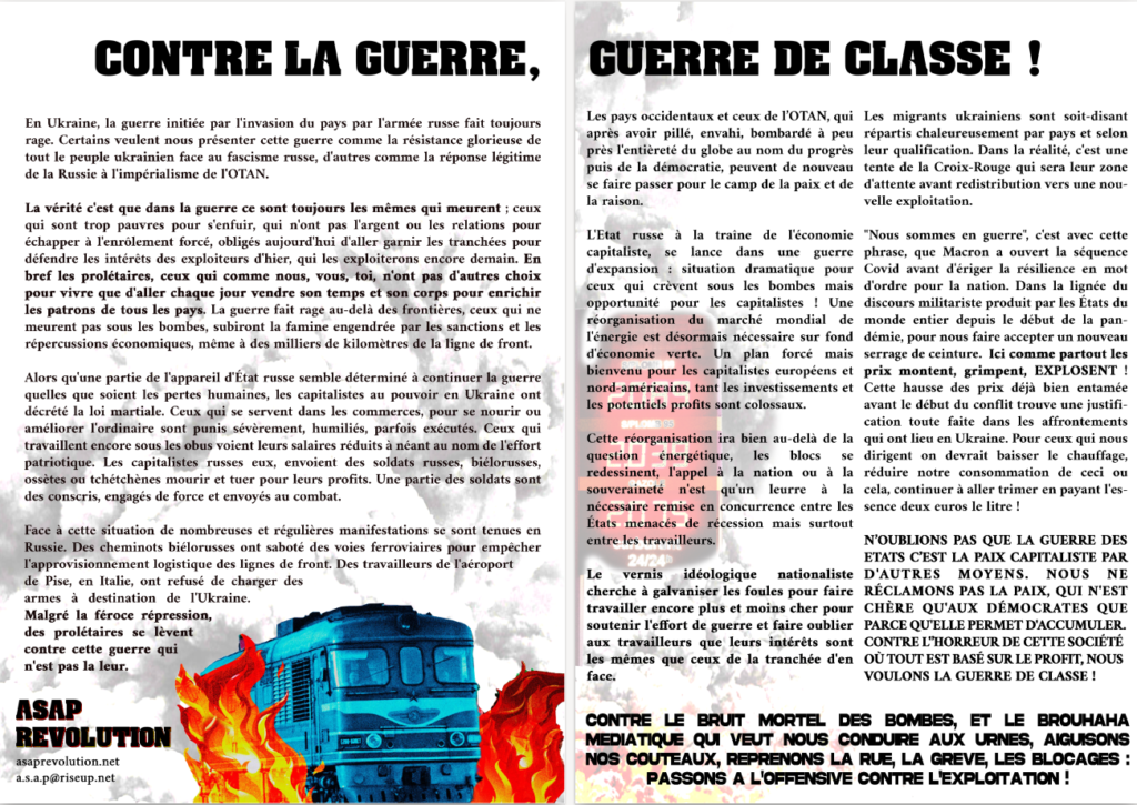 Face à cette situation de nombreuses et régulières manifestations se sont tenues en Russie. Des cheminots biélorusses ont saboté des voies ferroviaires pour empêcher l’approvisionnement logistique des lignes de front. Des travailleurs de l’aéroport de Pise, en Italie, ont refusé de charger des armes à destination de l’Ukraine. Malgré la féroce répression, des prolétaires se lèvent contre cette guerre qui n’est pas la leur.