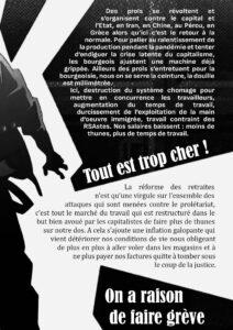 Tout est trop cher ! On a raison de faire grève ! C’est le tract que nous diffusons en ce moment dans les manifestations partout où nous pouvons. On vous invite tout les vendredi pour en discuter et débattre du mouvement actuel et de la période. Suite à l’expulsion du local on communiquera sur nos réseaux le lieu où on pourra se rencontrer, partager des textes, tracts, réflexions sur la période.