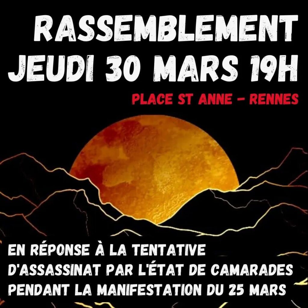 ▪️ Rassemblement pour les blessés à Sainte Soline en réponse à la tentative d’assassinat par l’État de camarades pendant la manifestation du 25 mars.