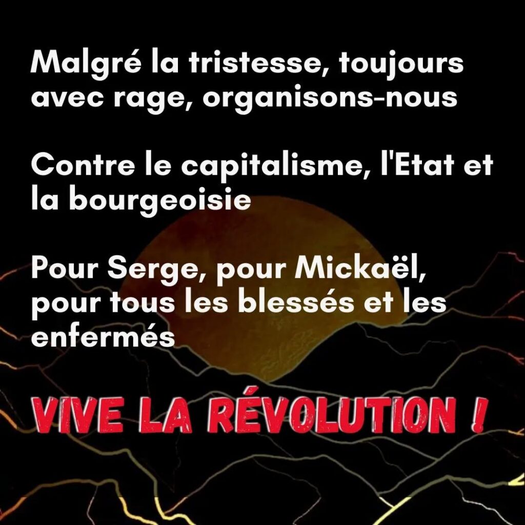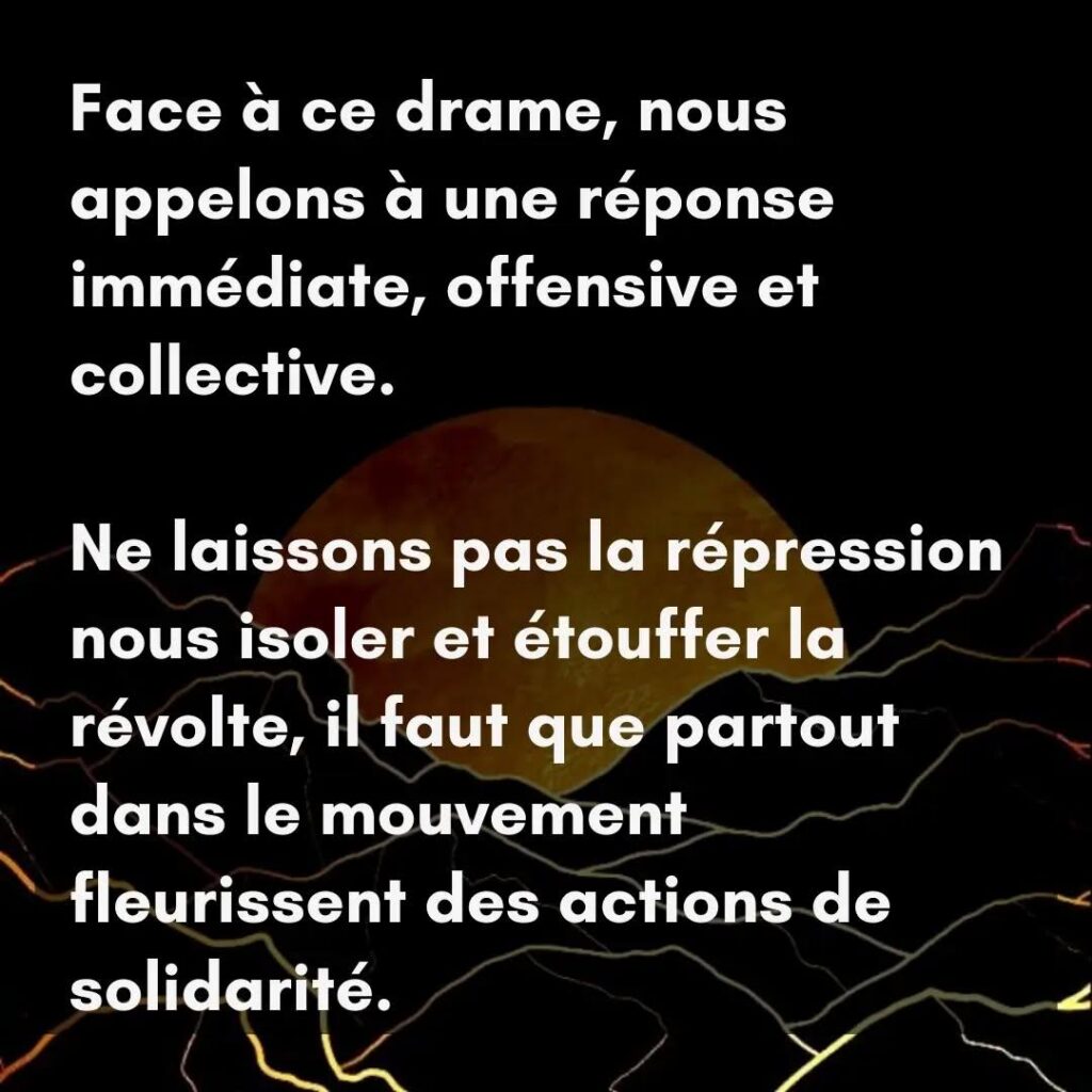 Face à ce drame, nous appelons à une réponse immédiate, offensive et collective. Ne laissons pas la répression nous isoler et étouffer la révolte, il faut que partout dans le mouvement fleurissent des actions de solidarité.