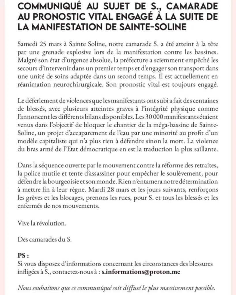 Pour notre camarade S. blessé à Sainte Soline. A diffuser partout!