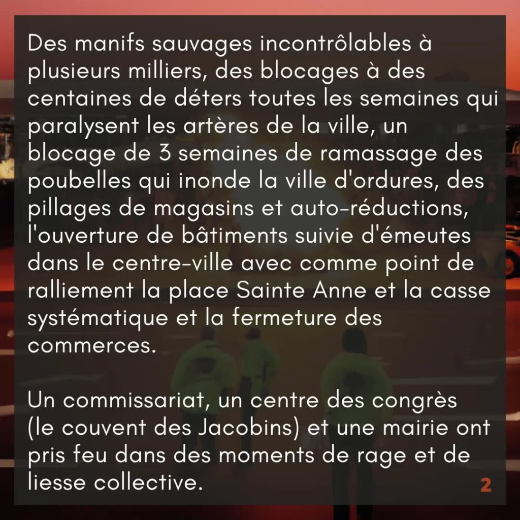 Des manifs sauvages incontrôlables à plusieurs milliers, des blocages à des centaines de déters toutes les semaines qui paralysent les artères de la ville, un blocage de 3 semaines de ramassage des poubelles qui inonde la ville d’ordures, des pillages de magasins et auto-réductions, l’ouverture de bâtiments suivie d’émeutes dans le centre-ville avec comme point de ralliement la place Sainte Anne et la casse systématique et la fermeture des commerces.