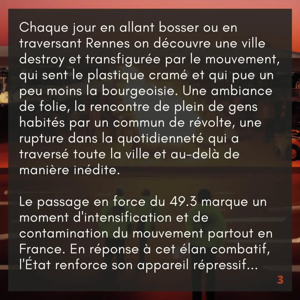 Le passage en force du 49.3 marque un moment d’intensification et de contamination du mouvement partout en France. En réponse à cet élan combatif, l’Etat renforce son appareil répressif pour casser les grèves dans les secteurs dits stratégiques, blesser et arrêter de plus en plus de gens, déloger les blocages et empêcher les assemblées.