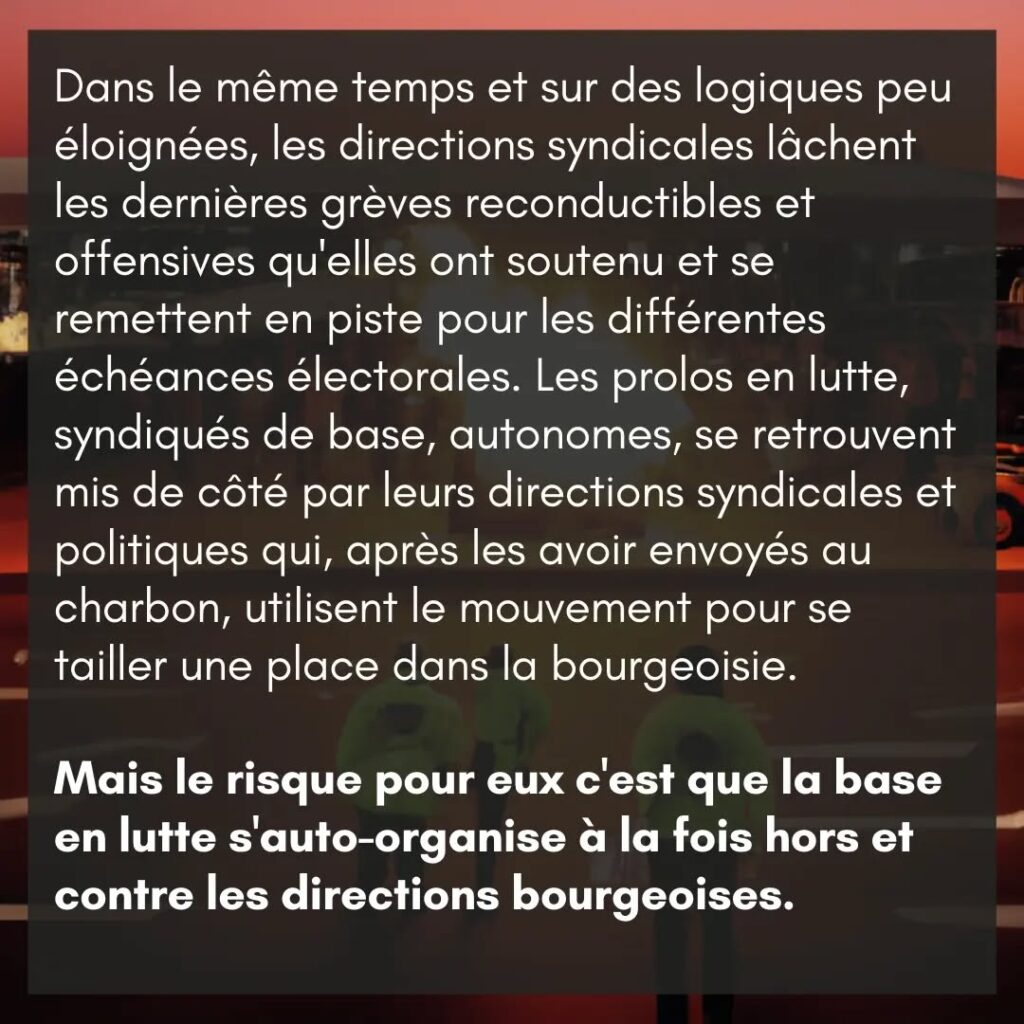 Les prolos en lutte, syndiqués de base, autonomes, se retrouvent mis de côté par leurs directions syndicales et politiques qui, après les avoir envoyés au charbon utilisent le mouvement pour se tailler une place dans la bourgeoisie. Mais le risque pour eux, et c’est déjà une séquence largement ouverte depuis les gilets jaunes qui continue d’une certaine façon aujourd’hui, c’est que la base en lutte s’auto-organise à la fois hors et contre les directions bourgeoises.