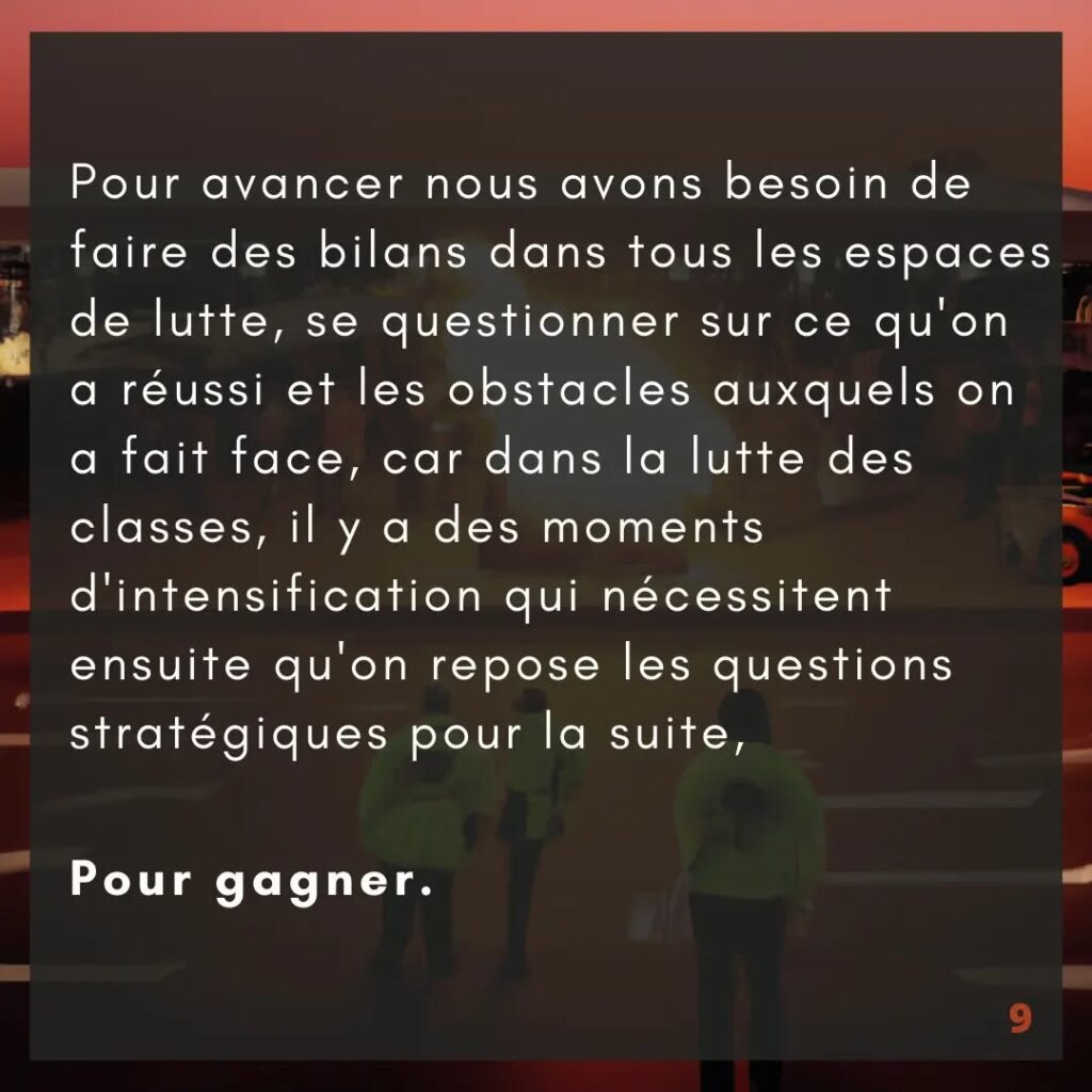 Pour avancer nous avons besoin de faire des bilans dans tous les espaces de lutte, se questionner sur ce qu’on a réussi et les murs auxquels on fait face, car dans la lutte des classes, il y a des moments d’intensification qui nécessitent ensuite qu’on repose les questions stratégiques pour gagner.