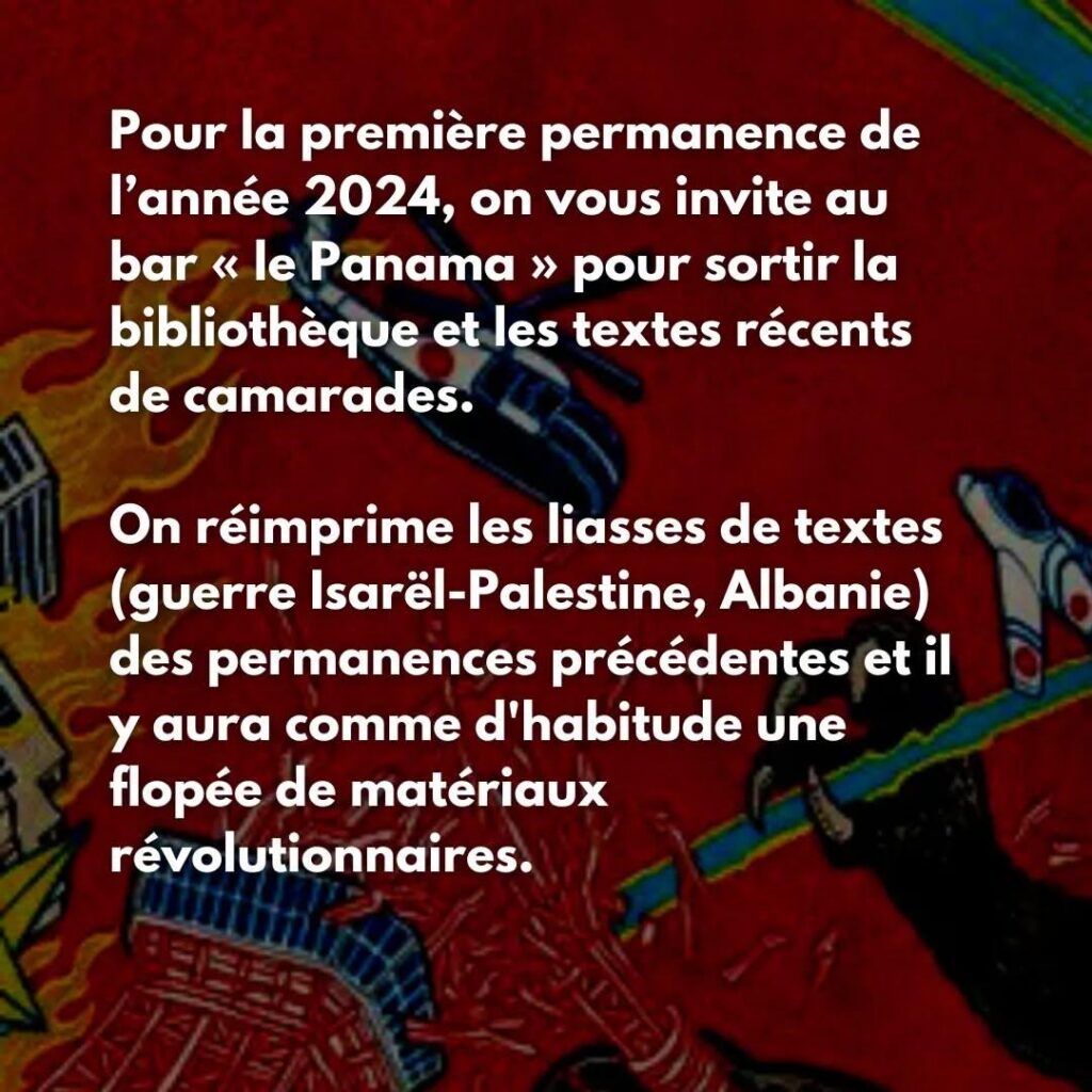 Pour la première permanence de l’année 2024, on vous invite au bar « le Panama » pour sortir la bibliothèque et les textes récents de camarades. On réimprime les liasses de textes (guerre Isarël-Palestine, Albanie) des permanences précédentes et il y aura comme d’habitude une flopée de matériaux révolutionnaires.