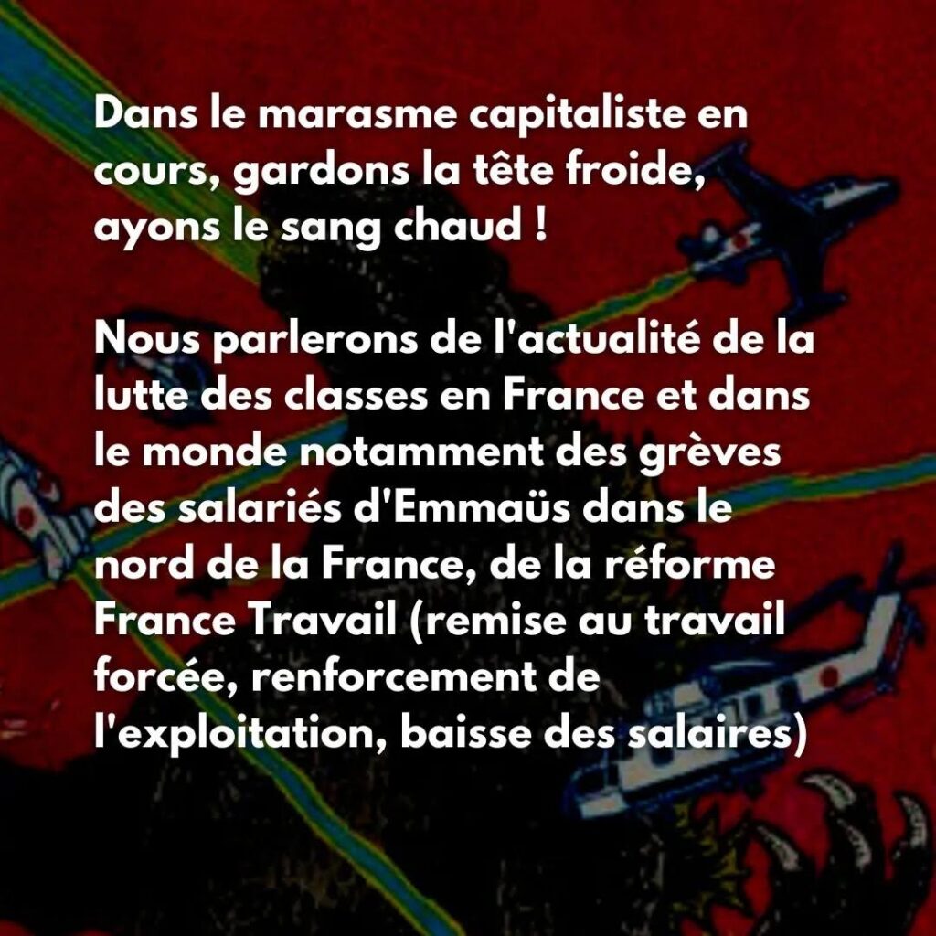 Dans le marasme capitaliste en cours, gardons la tête froide, ayons le sang chaud ! Nous parlerons de l’actualité de la lutte des classes en France et dans le monde notamment des grèves des salariés d’Emmaüs dans le nord de la France, réforme France Travail (remise au travail forcée, renforcement de l’exploitation, baisse des salaires)