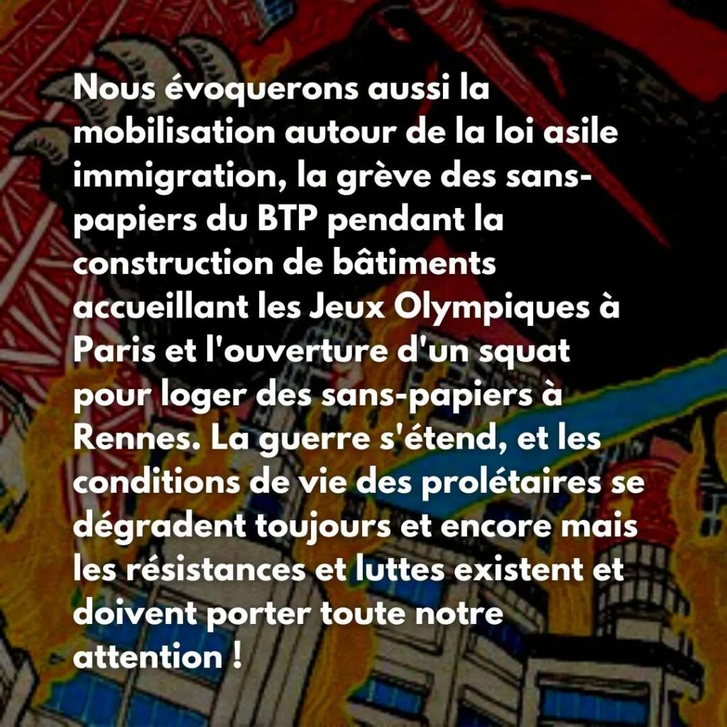 Ainsi que la mobilisation autour de la loi asile immigration, la grève des sans-papiers du BTP pendant la construction de bâtiments accueillant les Jeux Olympiques à Paris et l’ouverture d’un squat pour loger des sans-papiers à Rennes.